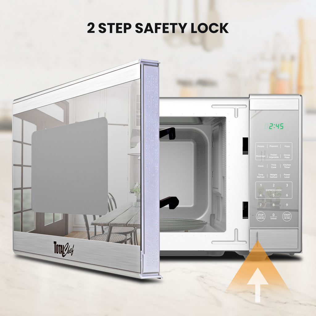 This compact and powerful 0.9 cu ft microwave is the perfect fit for college dorms, apartment kitchens, office lunch rooms, and much more. The 900W microwave features digital touch control, clear LED display, and a range of pre-set cooking modes including popcorn, potato, pizza, frozen vegetable, beverage, and reheat functions. It also has a kitchen timer, digital clock, defrost by weight or time, add 30 seconds, and 1-6 minute express cook options for extra convenience. Cleanup is quick and easy with a durable silver stainless steel exterior and white painted interior plus dishwasher-safe removable glass turntable and roller ring, making the Total Chef Compact Countertop Microwave Oven the ideal addition to any kitchen
