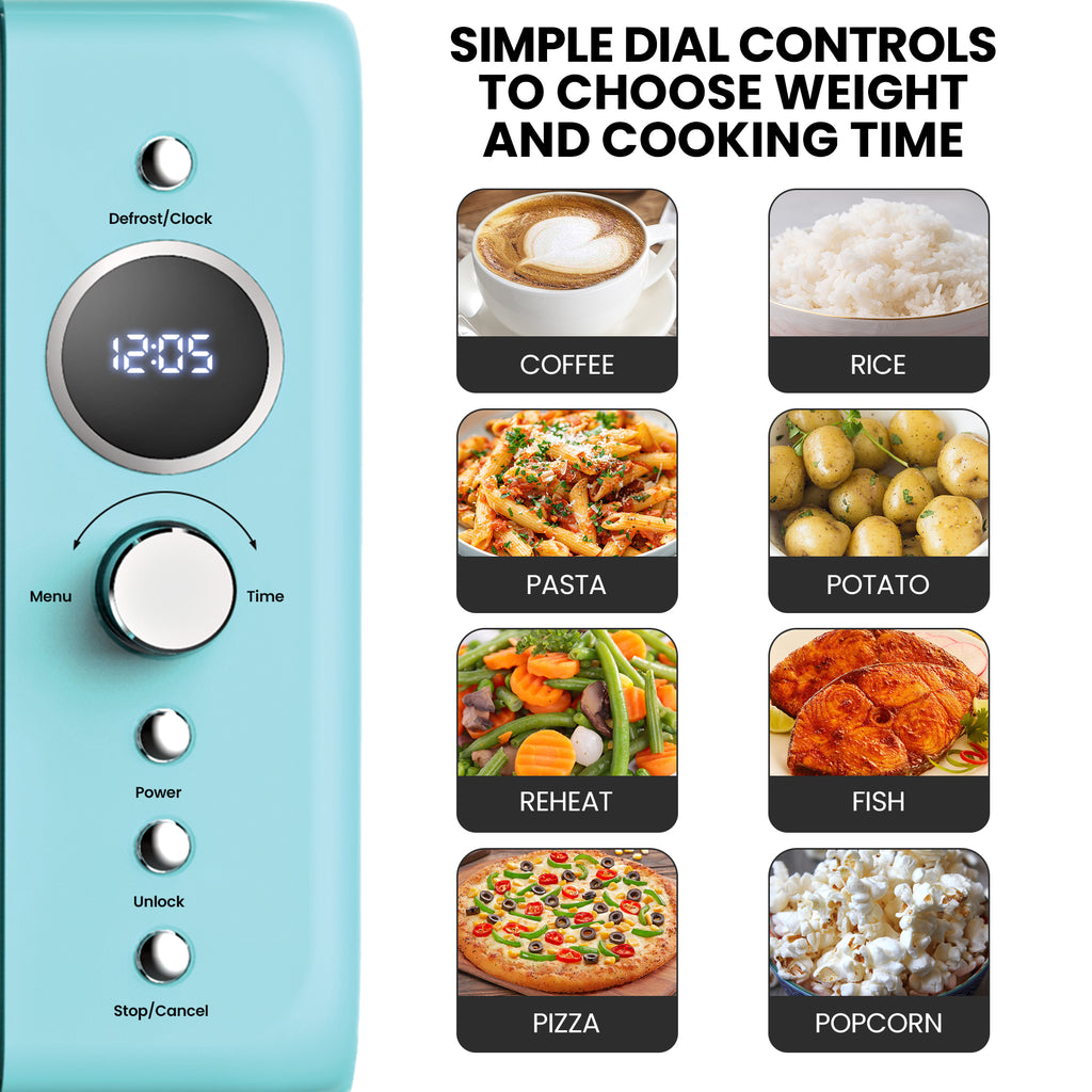 Eye-Catching Retro Look: Add a vintage vibe to your space with this unique retro-style microwave featuring a vibrant blue finish and shiny chrome accents. Space-Saving Design: Compact countertop microwave with 0.7 Cubic Foot (20L) capacity is the perfect solution for apartment kitchens, office lunch rooms, cottages, RVs, and dorm rooms. 8 Pre-Set Cooking Modes: Choose from 6 power levels or use the 8 pre-programmed functions to confidently reheat or cook coffee, rice, pasta, potato, fish, pizza, and popcorn in this 700W microwave. Easy to Operate: Bright LED display and simple dial and push-button controls, plus Quick Start and Weight/Time Defrost options make operating this versatile microwave oven a breeze. Effortless Cleanup: Exterior easily wipes down and the removable glass turntable and roller ring are dishwasher-safe for quick, hassle-free cleanup |