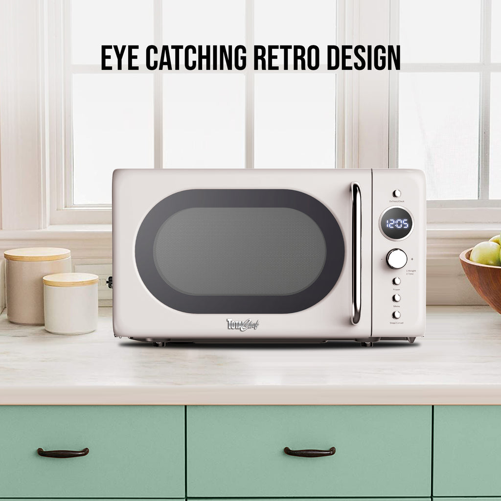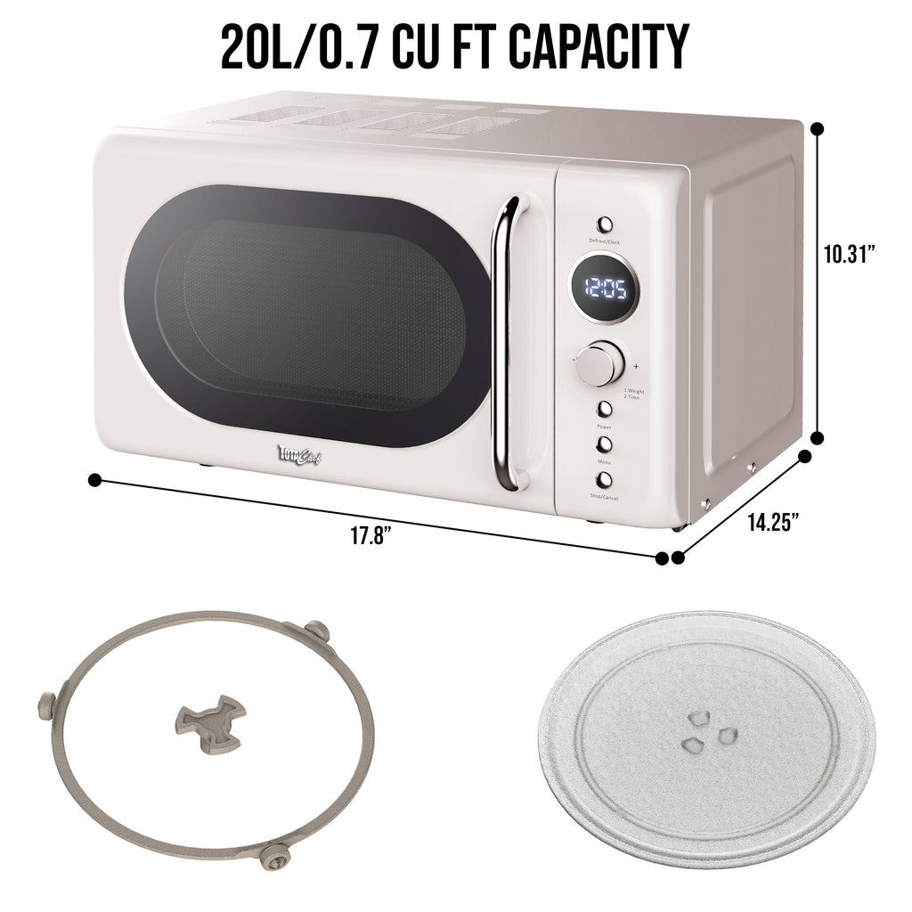 Retro-style microwave adds an eye-catching vintage vibe to your counter: This compact and powerful 0.7 cubic foot microwave with simple dial and push-button controls is ideal for apartment kitchens, office lunch rooms, cottages, or dorms. It features 700 Watts of cooking power with 6 power levels plus Quick Start and Defrost by weight or time options. Cook or reheat common items automatically with 8 pre-set cooking modes for coffee, rice, pasta, potato, fish, pizza, and popcorn. The sleek Cream exterior and chrome accents easily wipe down and the removable glass turntable and roller ring are dishwasher-safe for hassle-free cleanup.